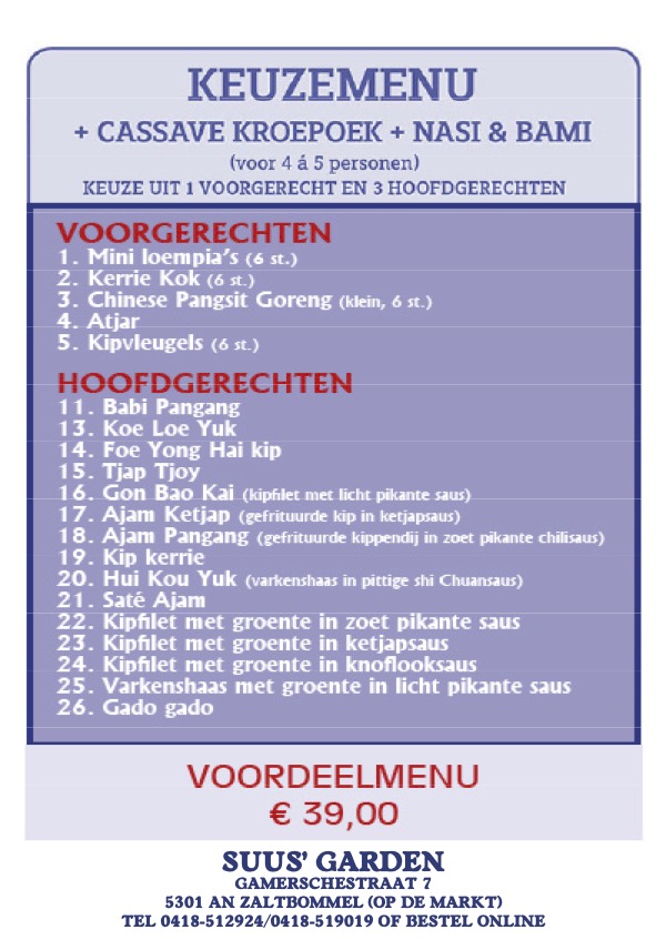 Menu’s voor € 12,00 p.p.